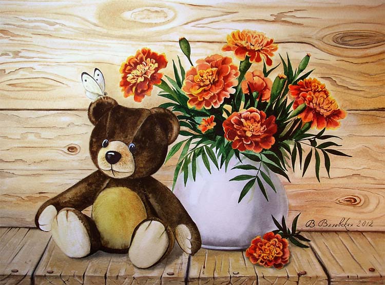 Много лет назад маленькой Девочке подарили плюшевого медвежонка. Девочка его сразу полюбила и назвала Мишей. С тех пор они не разлучались. Но время шло, и Девочка выросла, незаметно превратившись во взрослую Хозяйку дома. Теперь она реже брала своего любимца на руки, и Миша целыми днями сидел рядом с вазой, в которой стояли бархатцы. Медвежонку очень нравились эти цветы, наверное, потому, что своими бархатистыми лепестками напоминали плюш, из которого был сшит и он сам. Миша наслаждался слегка пряным ароматом цветов, напоминающим запах шоколада с цукатами, и терпеливо ждал. Дело в том, что Хозяйка по секрету сообщила ему, что скоро в доме появится новая маленькая Девочка, и медвежонку придётся о ней заботиться. Миша очень обрадовался, но никому ничего не сказал – ведь он обещал Хозяйке хранить этот секрет до поры до времени. Он только загадочно улыбался и ждал… акварель "Плюшевый Миша с бархатцами" – Валентина Валевская Сертификат публикации: № 1381-850867304-12091 Text Copyright © Анатолий Валевский Copyright © 2014 Романтическая Коллекция 23 Марта 2014