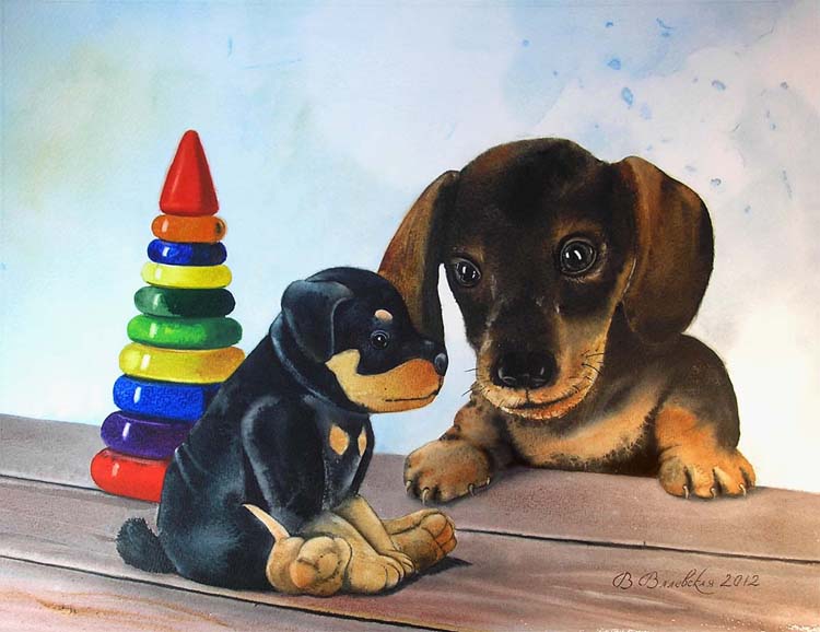 Плюшевый игрушечный щенок Кузя уже несколько лет был общим любимцем детей Хозяйки. Но с недавних пор в квартире появился ещё один щенок - настоящий. Этот маленький озорник с восторженным тявканьем носился из комнаты в комнату, словно ветер, поэтому его так и назвали - Ветерок. Дети повсюду бегали за ним, весело смеясь над проказами потешного малыша. Общительный Ветерок пытался познакомиться и с Кузей, чтобы вместе бегать по квартире. Но плюшевой игрушке не положено резвиться, поэтому Кузя молча сидел на столе и только иногда украдкой поглядывал на Ветерка. Игрушечный щенок не ревновал – он знал, что Ветерок вырастет и со временем станет большой собакой. А Кузя навсегда останется щенком, и когда-нибудь дети снова будут с ним играть… акварель "Два щенка" – Валентина Валевская Сертификат публикации: № 1381-3426653053-12122 Text Copyright © Анатолий Валевский Copyright © 2014 Романтическая Коллекция 27 Марта 2014