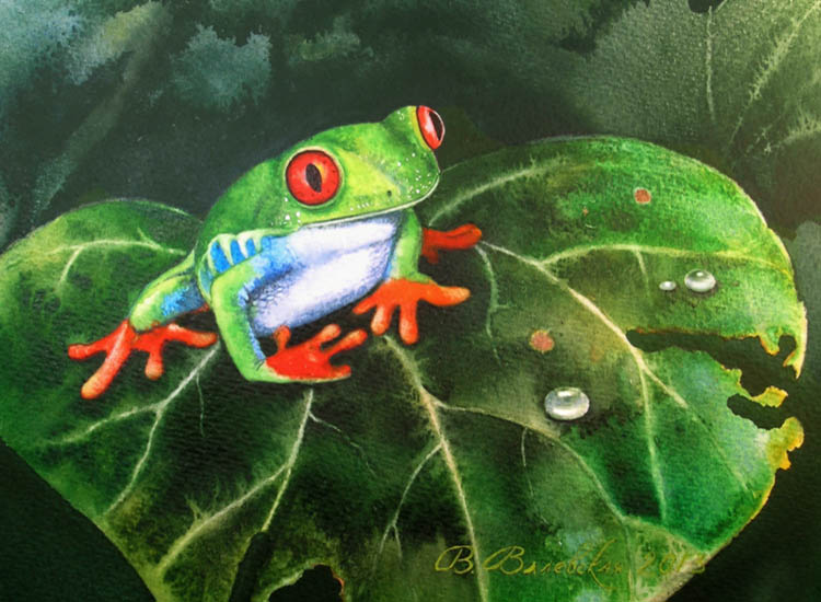 Под сенью пышных, раскидистых ветвей на листе старой лианы сидела грустная древесная лягушка и мечтала… представьте себе – она мечтала о принце! "Ах, я такая маленькая, такая зелёненькая с оранжевыми глазками и лапками, у меня такое белоснежное мягкое брюшко, окаймлённое небесно-голубыми разводами, - думала лягушка. – Я даже самой себе немножко нравлюсь… неужели же не найдётся хоть какой-нибудь завалящий принц, который захочет меня поцеловать? Уж я бы тогда – эх! Я бы при нём расцвела и стала первой красавицей!" И хоть принц всё никак не шёл, она терпеливо ждала, с надеждой глядя на извилистую тропинку, и тихо мечтала. Ведь каждый хочет любви и с надеждой ждёт её появления… Валентина Валевская - "Древесная лягушка" – акварель Сертификат публикации: № 1381-1687000384-16200 Text Copyright © Анатолий Валевский Copyright © 2016 Романтическая Коллекция 06 Июля 2016