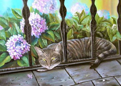 Все соседи знают Бандита – эту кличку кот получил за бойцовый характер и ухо, разорванное в отчаянной драке с лохматым бродячим псом, раньше часто появлявшимся в нашем дворе и пугавшим маленьких ребятишек. С тех пор пёс больше не появлялся. А Бандит по-прежнему живёт на чердаке и гордо хранит свою независимость, никому не даваясь в руки. Со стороны может показаться, что он угрюмый и даже злобный, но на самом деле, наверное, где-то в глубине своей кошачьей души он тайный романтик. Посудите сами: летними вечерами Бандит забирается в палисадник и, улёгшись у облюбованной им цветущей гортензии, часами о чём-то мечтает, задумчиво глядя вдаль… Валентина Валевская - "Кот и гортензия" - холст, масло Сертификат публикации: № 1381-3690321781-16209 Text Copyright © Анатолий Валевский Copyright © 2016 Романтическая Коллекция 07 Июля 2016