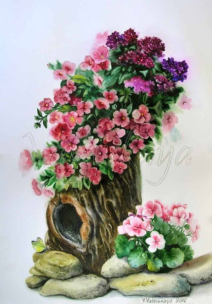 Ежегодно приходит пора, когда прохладные весенние вечера уступают место первым летним, наполненным очарованием буйного разнотравья. Пока ещё не вошёл в силу иссушающий зной, цветы спешат раскрыться во всей красе, чтобы продемонстрировать свою неповторимость и напоить воздух волшебными ароматами. И даже старый пень, чуть слышно поскрипывая и потрескивая задубевшей корой, с ностальгией вспоминает давно ушедшие годы своей былой юности, когда его раскидистая крона шумела, споря с ветром, и давала приют многочисленным птицам. Что ж, те времена канули в Лету, и вновь стать стройным могучим дубом вряд ли получится… но зато можно приютить буйно цветущую молодую поросль, послужить ей надёжной опорой, а взамен ощутить себя нужным и, чего уж скрывать – чуток моложе. Может быть, забота о подрастающих поколениях – это новое призвание, дающее смысл существованию?.. Наверное, именно поэтому тянутся к молодёжи старики, конечно, если только они не позабыли свою собственную юность и не стали жёлчными занудами… Валентина Валевская - "Цветы на пеньке" акварель Сертификат публикации: № 1381-441769464-16293 Text Copyright © Анатолий Валевский Copyright © 2016 Романтическая Коллекция 22 Июля 2016