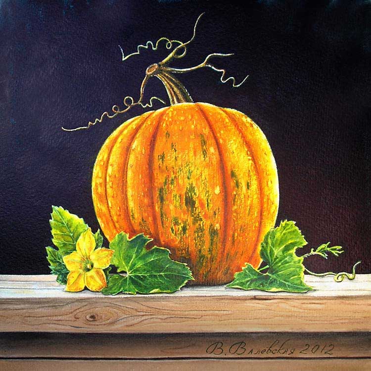 На огородной грядке позади дома старого фермера вызрела крутобокая и, как ни странно, романтическая тыква. Млея под лучами ласкового августовского солнца, она мечтала о том, как из неё к празднику Велесовой ночи, а по-новомодному – Хэллоуину выймут сочную мякоть, прорежут глаза и рот и вставят внутрь свечу или фонарик, чтобы получилась пустотелая голова со светящимися глазами. Наверное, было бы весело пугать таким образом по вечерам сельскую малышню, представляясь каким-нибудь сказочным существом из давно забытых легенд, а ещё лучше – пришельцем из другой галактики... но фермер решил по-иному. Созревшую ароматную красавицу он пустил на тыквенную кашу, а крупные семечки высушил, чтобы долгими зимними вечерами щелкать их, глядя в тёмное окошко на холодные, заснеженные поля. Что ж, каша тоже хороша, особенно, если приготовлена умелой хозяйкой. А мечты… они ведь не всегда сбываются, мы-то знаем… Валентина Валевская - "Натюрморт с тыквой" акварель Сертификат публикации: № 1381-1750273981-16351 Text Copyright © Анатолий Валевский Copyright © 2016 Романтическая Коллекция 04 Августа 2016