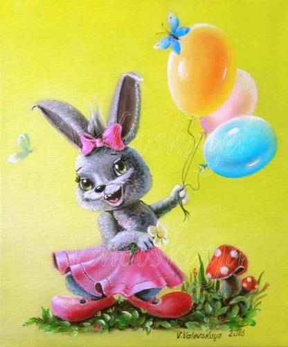 Когда маленькой Веронике исполнился годик, любящая бабушка нарисовала для неё улыбающуюся озорную зайчишку в розовой юбочке и с бантиком такого же цвета. В лапках она держала разноцветные воздушные шарики и ромашку – подарки для малышки Ники. Правда алые туфельки Зайке оказались великоваты, но что поделать, если она, как и Вероника, очень любила надевать обувь взрослых. Впрочем, всем маленьким девочкам почему-то очень нравится щеголять в туфлях мамы или старшей сестры, особенно, если обувь на высоких каблуках. Валентина Валевская "Весёлая Зайка" – холст, масло Сертификат публикации: № 1381-3927584573-16762 Text Copyright © Анатолий Валевский Copyright © 2016 Романтическая Коллекция 02 Ноября 2016