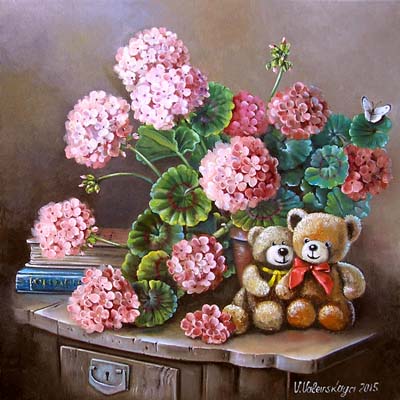 Валентина Валевская "Герань и медвежата" – холст, масло