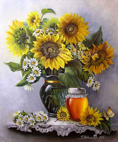 Каждый цветок привлекателен особой, неповторимой красотой, и для каждого есть своё время. В знойном июле пышными золотисто-жёлтыми коронами от края и до края царят на полях высокие стройные подсолнухи. Беззаботно порхают лёгкие бабочки. Весело стрекочут кузнечики. Озабоченно гудят пчёлы-трудяги, заботливо собирая ароматную дань, чтобы превратить её в сладостный янтарный мёд. Потом будут ещё семечки и масло, но пока взор отдыхает на пышных горячих цветах. И если даже за окном льёт дождь, то букет медовых подсолнухов наполнит дом светом и солнечным теплом – ведь не зря их называют цветами солнца… Валентина Валевская - "Медовые подсолнухи" - холст, масло Сертификат публикации: № 1381-804318547-17159 Text Copyright © Анатолий Валевский Copyright © 2016 Романтическая Коллекция 28 Декабря 2016