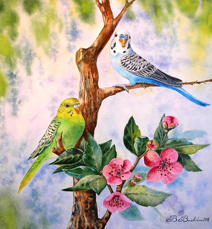 У одинокого пожилого настройщика роялей живут два волнистых попугайчика – Петруша и Кеша. Хозяин сделал для своих любимцев такую просторную клетку, что она занимает половину стола в большой комнате. Но в клетке попугайчики находятся только во время отсутствия настройщика. Когда же он дома, то выпускает питомцев летать по квартире, а сам устраивается поудобней в старом, но ещё крепком кресле и погружается в чтение своих любимых книг. Валентина Валевская - "Петруша и Кеша" – акварель Сертификат публикации: № 1381-2946489011-17163 Text Copyright © Анатолий Валевский Copyright © 2016 Романтическая Коллекция 29 Декабря 2016