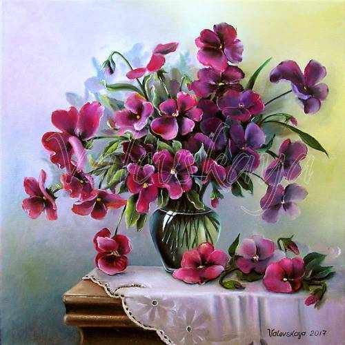 Всё проходит, как сказал мудрец, но ничто не проходит бесследно. И вот уже отвьюжили неугомонные снежные метели, укутывавшие спящую природу в белую пушистую шубу. Отзвенели прощальной мелодией вешние капели, истаивая слезинками хрустальных сосулек на краях крыш и карнизов. О чём они плакали, нам не дано знать. Но, сливаясь в игривые ручьи, их слёзы дали живительную влагу пробуждающейся, словно спящая красавица, природе. Первыми проросли свежей зеленью, согретые ласковыми солнечными лучами, просыпающиеся пригорки, а за ними уже и вся земля. Наполнились птичьими песнями ожившие рощи. И откуда-то из прекрасной сказочной дали с любопытством выглянули в наш мир нежные анютины глазки – один из вечных символов постоянно возрождающейся по весне природы. Правда, ботаники называют эти цветы виолами или трёхцветными фиалками. Что ж, им – учёным, виднее, но, согласитесь, анютины глазки звучит гораздо душевнее. А уж если и вовсе ласково, то просто анютки. И не зря этот цветок называют символом верности влюблённых, ведь по старинной традиции молодая девушка дарила анютки только своему суженому, а это многое значит! И пусть всегда радуют глаз эти прекрасные, нежные цветы, окружённые ореолом чувственной романтики и сладостных мечтаний, потому что ничего не проходит бесследно. И пока живы анютки, жива и любовь… Валентина Валевская - "Анютки" - холст, масло Сертификат публикации: № 1381-2960971579-17844 Text Copyright © Анатолий Валевский Copyright © 2017 Романтическая Коллекция 02 Мая 2017