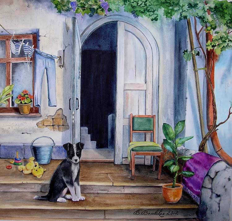 Кто в доме главный? Вопрос, безусловно, риторический, по крайней мере, для Тимки. Он-то уж совершенно точно знает. Сами посудите: все куда-то периодически уходят, затем приходят, что-то приносят – уносят, словом – суетятся без всякого толку… не считая, конечно, когда приносят пахучие сосиски или там косточки всякие. А кто дом будет охранять, за порядком следить, голубей глупых гонять, чтоб не стащили чего? То-то и оно! Тимон за всё ответственный. Да ещё и хозяев подбодрить надо, когда они со своей этой самой… работы или учёбы возвращаются. Набегаются за день, устанут, ласки хочется, вот и тянутся к Тимке – животик ему почесать. Видать, легче им от этого становится. Тимон не возражает, терпит – пусть уж потешатся. Да и, честно говоря, ему самому тоже немножко нравится. Правда иногда, бывает, прикрикнут ни за что, но Тимка не обижается – чего с них, людей взять? Разве ж они понимают толк в щенячьей жизни?! Ну да ничего, авось время расставит всё на свои места… Валентина Валевская - "Сторож" – акварель Сертификат публикации: № 1381-2655908435-17996 Text Copyright © Анатолий Валевский Copyright © 2017 Романтическая Коллекция 05 Июня 2017