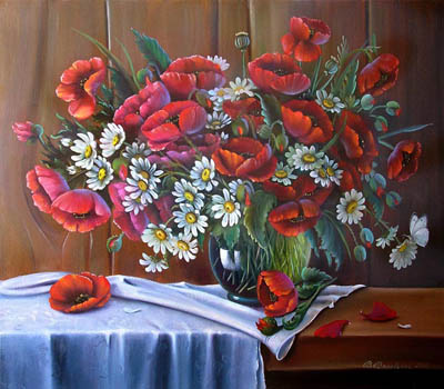 Валентина Валевская - "Ромашки с маками" холст, масло