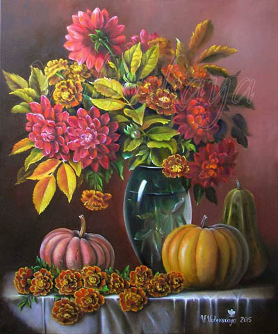 А пока собрали цветы и тыквы на столе в осенний букет. Пусть порадуют напоследок теплом ушедшего лета и остывающей золотой осени. Ведь скоро зима…