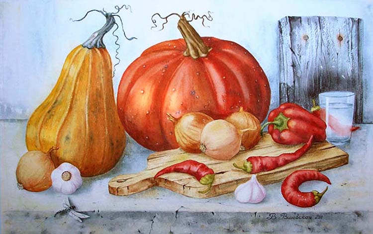 Потерянно и уныло топчется по серым холодным лужам монотонный осенний дождь, вздуваясь на поверхности грязных зеркал мутными пузырями. Отчаянно цепляясь за ветки, обессилено покачиваются последние бурые листья, отяжелевшие от переизбытка влаги. Но и эти одиночки скоро опадут на тёмную, дремлющую до весны землю. Всему предписан свой срок - не за горами уже и зима с трескучими морозами да метелями. Но пока сыро и зябко за окном. Но внутри натопленного дома тепло и уютно. А чтоб и вовсе было хорошо, неплохо бы приготовить что-нибудь вкусненькое... а хоть бы и из тыквы - её-то уродилось в этом году прорва! Можно, конечно, сладкую и сочную тыквенную запеканку с творогом или, допустим, запечь ломтиками с сыром, но сегодня почему-то хочется просто затушить тыковку с овощами, тем более, что это ведь совсем не сложно. Всего-то и нужно, что очистить тыкву, нарезать ломтиками, добавить мелко покрошенный лук и чуть крупнее болгарский перец. Да, неплохо бы ещё и морковочки, натёртой на средней тёрке, и чуток красного стручкового перца. Всё это перемешать, посолить, добавить масла, выложить в кастрюлю с толстым днищем и накрыть крышкой. Всё. Осталось только набраться терпения, пока вкуснотень будет тушиться на среднем огне где-то с полчасика. Для особых ценителей уже в самом конце можно добавить немного сушёного укропа и петрушки, но это уж на любителя. И вот, как говорят французы: "Вуаля!" - всё готово, осталось только наслаждаться. Обыкновенная тыква, а сколько радости она нам приносит, особенно осенью и зимой... Валентина Валевская - "Осенний натюрморт" акварель Сертификат публикации: № 1381-3893113614-19614 Text Copyright © Анатолий Валевский Copyright © 2018 Романтическая Коллекция 19 Мая 2018
