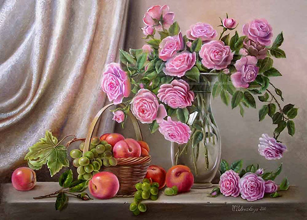 Валентина Валевская - "Розы, персики и виноград" - холст, масло