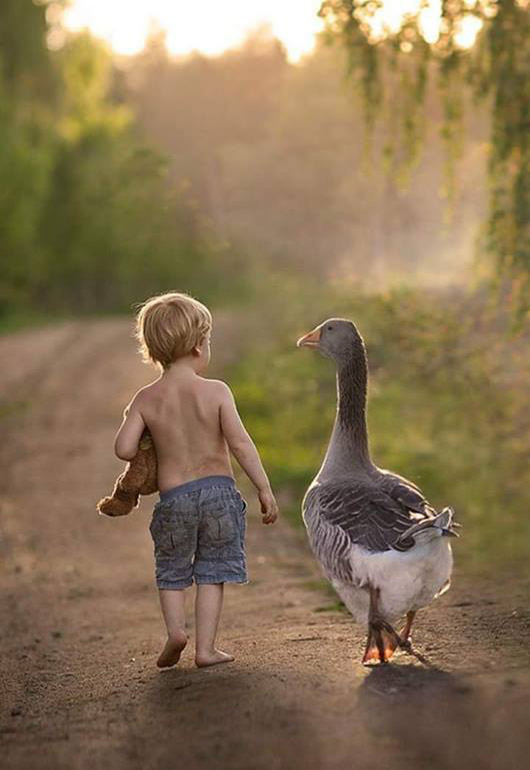Каким должен быть друг? На этот вопрос каждый ответит по-своему, но в одном все сойдутся обязательно: друг должен быть настоящим! Вот и Гоша так считает. И дело даже не в том, что Малыш всегда припасает для него что-нибудь вкусненькое. Хотя, если признаться честно, очень даже неплохо иногда полакомиться сочной морковкой или сахарной свёклой, не говоря уже о кусочках мела и особенно чайного печенья... но об этом лучше никому не говорить, а то Малыша заругают. Впрочем, главное не в этом, а в том, что всё своё свободное время друзья проводят вместе. Уже давно никто не удивляется, глядя на мальчика и гуся, вместе дружно шагающих купаться в канаве на околице села. Хоть там и не глубоко - Малышу всего лишь по пояс, но Гоша доволен, потому что может не опасаться за своего друга, который ещё и плавать-то толком не научился. Ничего, что приятели выглядят по-разному, на настоящую дружбу это совершенно не влияет. Правда мальчик зачем-то повсюду носит за собой любимого плюшевого медвежонка, но гусь не ревнует - ведь это всего лишь игрушка, к тому же и разговаривать не умеет. А Гоша с Малышом очень любят поболтать. Правда говорят они на разных языках - один что-то шепеляво лопочет, а другой гогочет по-своему, но при этом они очень хорошо друг друга понимают. С глупыми дворовыми гусями Гоше совсем не интересно, а Малыш всегда ему что-то рассказывает, иногда даже коротенькие стишки, которые выучил вместе с мамой, поэтому со своим маленьким другом Гоша готов идти хоть на край света, хотя и не знает, где это находится...