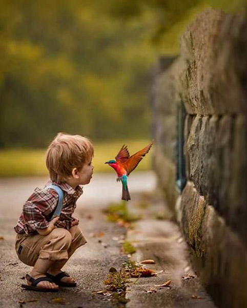 Когда мы становимся взрослыми, то постепенно всё реже удивляемся тому, что окружает нас, теряя способность искренне радоваться пусть небольшим, но всё же открытиям. Ежедневные заботы незаметно стирают волшебные кисти воображения, которыми в детстве мы раскрашивали свой маленький мир яркими красками восторга. Помните ту, самую первую самостоятельную поездку на двухколёсном велосипеде, когда наконец-то удалось удержать равновесие? А когда впервые увидели море и хлебнули солёной воды, с головой погрузившись в искрящуюся на солнце набегающую волну и там увидели живую рыбку?! Да, есть что вспомнить, если хорошенько покопаться в памяти. Но и сегодня осталось ещё много прекрасного и чудесного в окружающем мире, нужно только внимательно смотреть по сторонам и открывать сердце. Вон там у каменной стены присел на корточки светловолосый малыш. Затаив дыхание и восторженно открыв рот, он внимательно рассматривает яркую птичку, зависшую перед ним. А пернатая красавица в свою очередь доверчиво приблизилась к мальчику, забыв об извечной осторожности. Ей и самой любопытно познакомиться с маленьким человечком, который, словно солнышко, излучает душевное тепло и восхищение. Удастся ли ему сохранить это, когда он станет взрослым? Сумеет ли пронести искренний свет радости познания через годы?.. Что ж, будем надеяться. А пока не станем мешать новому знакомству, чтобы не нарушать чудесный миг очарования. Ведь согласитесь, не каждый день можно увидеть подобную сцену...