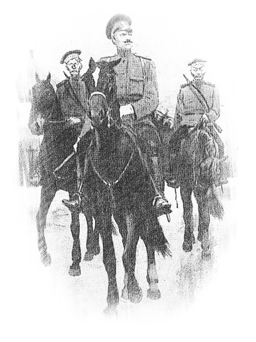 Среди скопления людей гарцевали на конях несколько казаков. Один из седоков, видимо, старший, размахивал нагайкой и грозно кричал на испуганную толпу: