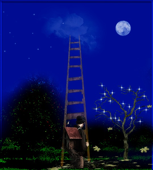 Жил-был Чудак. Его настоящим именем не интересовались, а чудаком прозвали за слишком уж вежливые манеры и скромность, которыми отличался, как белая ворона. Он любил музыку, стихи и цветы, а особенно – звёзды. Откуда и когда пришёл этот мечтатель в тихий городок, никто не заметил, потому что, как всегда, каждый был занят собственными делами. Поначалу на него и вовсе внимания не обратили – мало ли кто там появился, лишь бы не мешал. Жизнь шла своим чередом, и никто даже не вспомнил бы о застенчивом пришельце, если бы однажды один из соседей не заметил, как Чудак мастерит в саду лестницу. Да не простую, а такую высокую, словно собирался взобраться по ней на небо. Вскоре об этом знала уже вся округа, и за странным соседом начали приглядывать. А он всё наращивал лестницу и наращивал. И вот настал час, когда она стала такой высокой, что её верхние перекладины уже было и не разглядеть. Правда, у соседей к тому времени кончилось терпение следить да подглядывать, и они снова занялись своими повседневными делами. Поэтому-то никто и не заметил, как однажды в полночь, прихватив самодельное лукошко с крышкой, Чудак начал взбираться по лестнице и вскоре скрылся за облаками, а вернулся лишь под утро – уставший, но счастливый. Сквозь щели плотно закрытого лукошка сочилось лёгкое серебристое сияние. С тех пор каждую ночь общепризнанный романтик отправлялся в свои загадочные путешествия по лестнице.