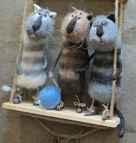 У моей знакомой в дальнем углу комнаты что на втором этаже, за старым книжным шкафом на подвесной деревянной полочке живут-поживают трое войлочных приятелей. Хозяйка с улыбкой называет этих котов проказниками. Что ж, ей виднее, ведь она сделала их собственными руками. Коты послушно молчат, делая вид, что согласны, хотя на самом деле считают иначе. По их собственному мнению, никакие они не проказники, а совершенно безобидные шалунишки, иногда, вернее - постоянно тайком затевающие весёлые игры. Но что в этом плохого?! Ведь, наверное, все любят хоть иногда пошалить. А так как приятелей трое, то и шалят они в три раза больше, чем другие. Но, конечно же, никаких пакостей эти войлочные котики себе не позволяют – вы только посмотрите на их милые мордашки, на которых написано само смирение и послушание. Даже хочется за это наградить их чем-нибудь вкусненьким. Но если внимательно приглядеться, то в глубине глаз-бусинок можно уловить едва заметные искорки затаённой хитрости, которые нет-нет да и посверкивают от нетерпения, словно вот-вот выпрыгнут и затеют очередную шалость. Однако приятели терпеливо молчат и только с укоризной поглядывают на хозяйку – вот, мол, другие коты за окном вон чего вытворяют, а мы-то тут на полочке стоим себе смирнёхонько и даже не мяукаем, хоть и очень хочется… Правда, что они вытворяют по ночам и как озорничают, когда все спят, никто не знает… кроме меня, потому что шалуны-затейники сами рассказали мне об этом по большому секрету, а я вам. Только вы уж, будьте добры, никому больше! Ведь всё же секрет – есть секрет!