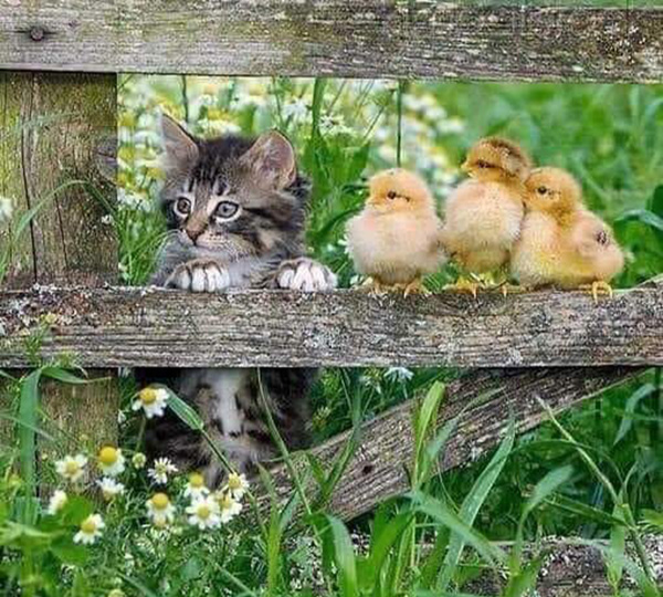 Что там происходило – неведомо, но когда поутру хозяйка зашла внутрь, то обнаружила рядом с гнездом наседки бездыханную кошку, а сама Рыжуха выглядела несколько ошарашенно. Причина такого её состояния выяснилась довольно быстро – из-под курицы донёсся жалобный писк и перья на её боку вздулись, словно там что-то шевелилось. Хозяйка осторожно раздвинула перья и с изумлением увидела маленький серый комочек. Это был новорожденный котёнок, который ещё и глазки не открыл. Женщина хотела забрать его, но Рыжуха протестующе заквохтала и даже легонько клюнула руку хозяйки. Вот так и получилось, что малыш, которого прозвали Мурзиком остался со своей приёмной мамой – Рыжухой. Сердобольная хозяйка похоронила кошку, а котёнка подкармливала молочком из бутылочки.