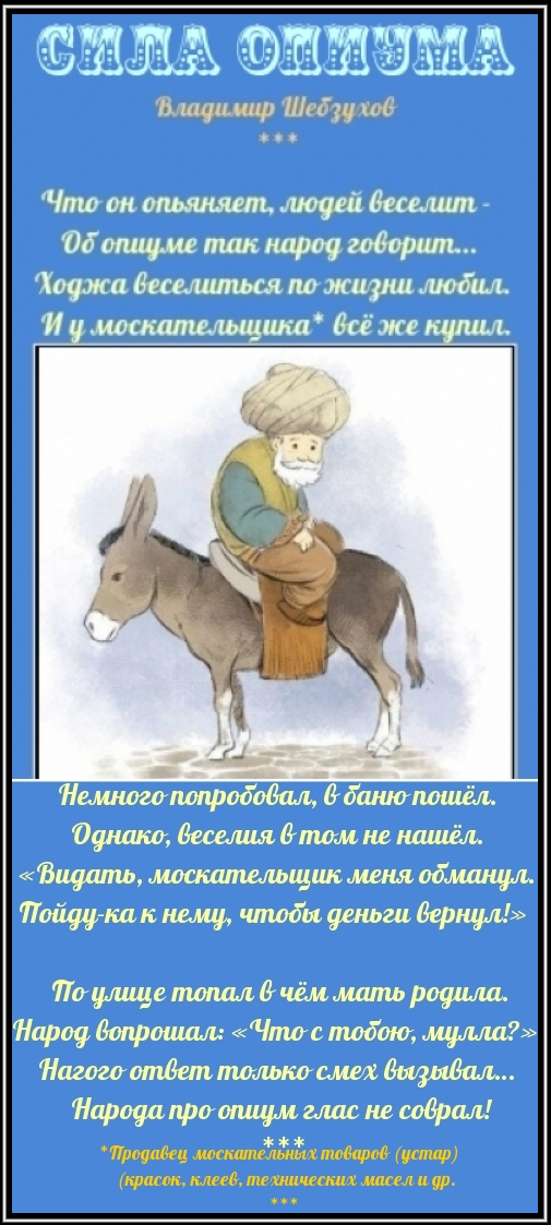 Что он опьяняет, людей веселит, Немного попробовал, в баню пошёл. По улице топал в чём мать родила. * Сертификат публикации: № 1323-323589047-26338 Text Copyright © Владимир Шебзухов Copyright © 2022 Романтическая Коллекция 02 Апреля 2022
