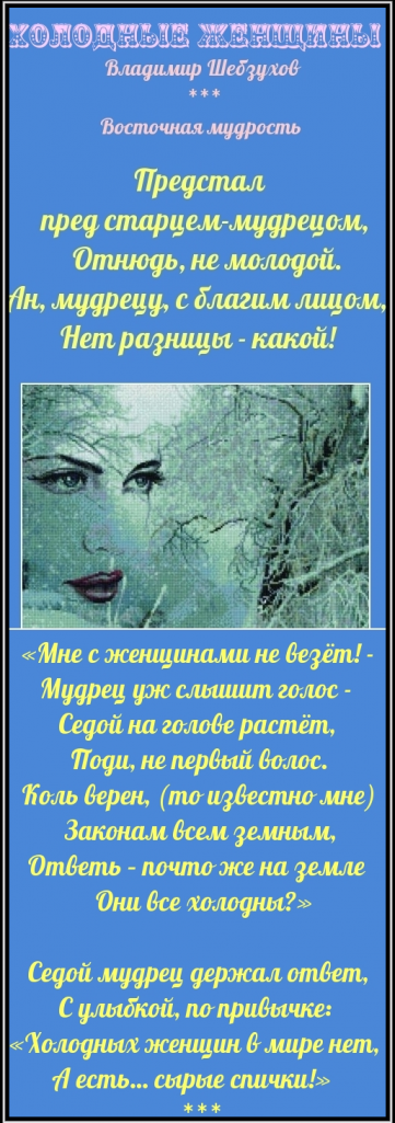 «Мне с женщинами не везёт! - Коль верен, (то известно мне) Седой мудрец держал ответ, Сертификат публикации: № 1323-2288185593-26354 Text Copyright © Владимир Шебзухов Copyright © 2022 Романтическая Коллекция 06 Апреля 2022