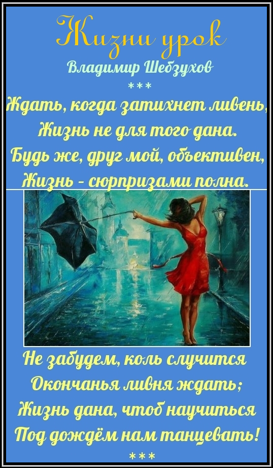Ждать, когда затихнет ливень, Не забудем, коль случится Сертификат публикации: № 1323-3140599320-26408 Text Copyright © Владимир Шебзухов Copyright © 2022 Романтическая Коллекция 16 Апреля 2022