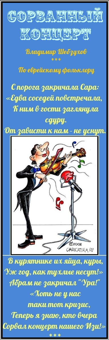 По еврейскому фольклору С порога закричала Сара: Абрам не закричал "Ура!" Сертификат публикации: № 1323-1403997861-26547 Text Copyright © Владимир Шебзухов Copyright © 2022 Романтическая Коллекция 17 Мая 2022