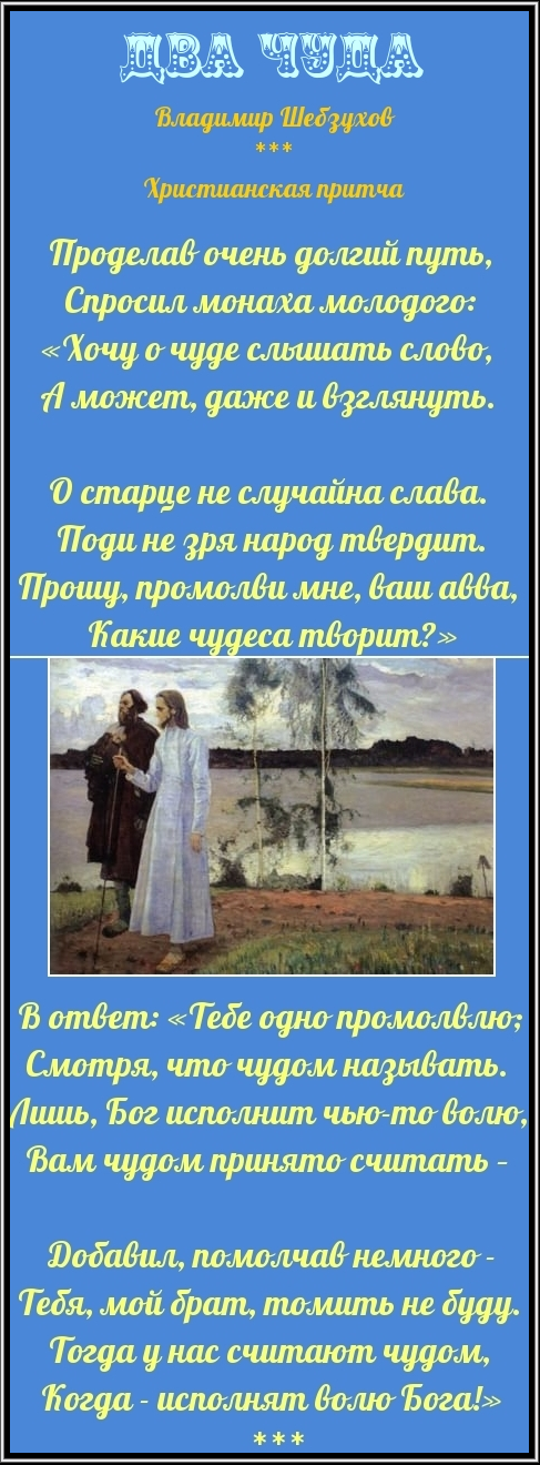 Христианская притча Проделав очень долгий путь, О старце не случайна слава. В ответ: «Тебе одно промолвлю; Добавил, помолчав немного - Сертификат публикации: № 1323-43629302-26576 Text Copyright © Владимир Шебзухов Copyright © 2022 Романтическая Коллекция 24 Мая 2022