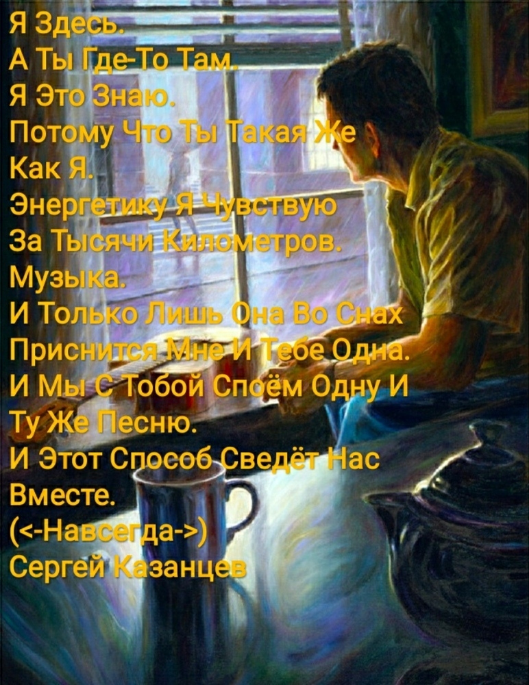 Я Здесь А Ты Где-То Там Я Это Знаю Потому Что Ты Такая Же Как Я Энергетику Я Чувствую За Тысячи Километров Музыка И Только Лишь Она Во Снах Приснится Мне И Тебе Одна И Мы С Тобой Споём Одну И Ту Же Песню И Этот Способ Сведёт Нас Вместе (<-Навсегда->) ©Сергей Казанцев©