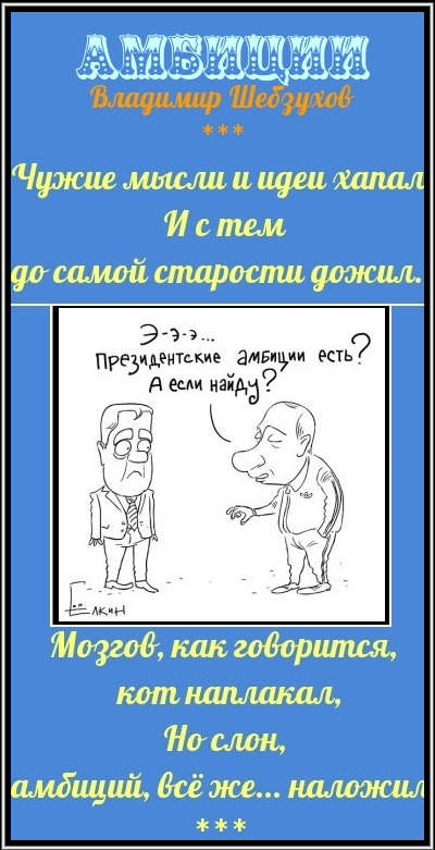 Чужие мысли и идеи хапал Мозгов, как говорится, кот наплакал, Сертификат публикации: № 1323-118151276-27078 Text Copyright © Владимир Шебзухов Copyright © 2022 Романтическая Коллекция 10 Сентября 2022