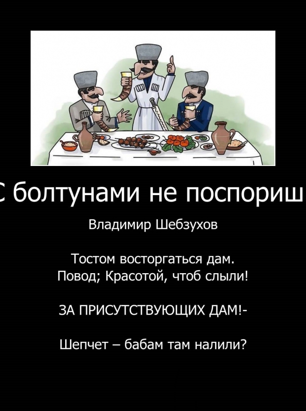 С болтунами не поспоришьТостом восторгаться дам. ЗА ПРИСУТСТВУЮЩИХ ДАМ!- Шепчет – бабам там налили? Сертификат публикации: № 1323-3777420832-28518 Text Copyright © Владимир Шебзухов Copyright © 2023 Романтическая Коллекция 06 Августа 2023
